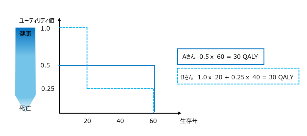 たとえば、AさんとBさんはいずれも60年間生存しましたが、健康状態の推移に違いがありました。Aさんは、最初から健康状態があまり良くなく、効用値0.5の状態で60年間を過ごしました。