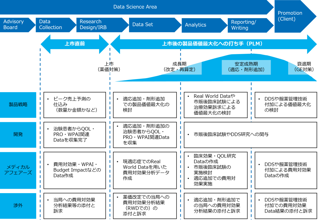 製品が上市されると時間の経過により、リアル・ワールド・データ(RWD: Real World Data)として実臨床での使用実態などの情報が蓄積されていきます。この蓄積されたRWDを解析してエビデンスを創出することは、製品の「成長期」においてシェアを拡大して高い売り上げピークを達成するために重要な活動となります。